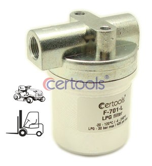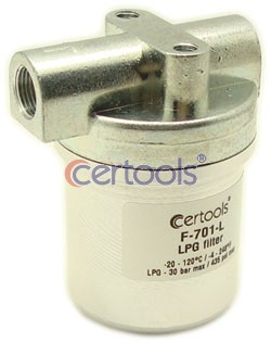 Zespół filtra LPG fazy płynnej wielokrotnego użytku z wymiennym wkładem z włókna szklanego (CF-115-2). Posiada wlot i wylot pod rurkę miedzianą D=6mm (M10x1) lub D=8mm (M12x1). Zakres temperatury pracy od -20°C do 120°C. Maksymalne ciśnienie pracy 3000 kPa. Homologacja: E20-67R-010531 Zastosowanie: wózki widłowe, kosiarki