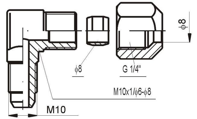 Redukcja kątowa do rurki Cu ø6/ø8 Kpl., M10
